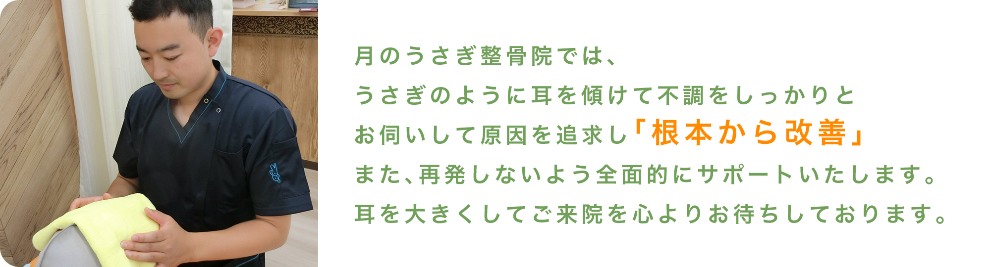 月のうさぎ整骨院では、うさぎのように耳を傾けて不調をしっかりとお伺いして原因を追求し「根本から改善」また、再発しないよう全面的にサポートいたします。耳を大きくしてご来院を心よりお待ちしております。